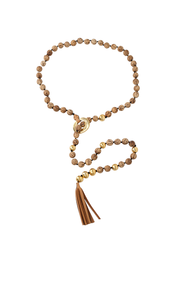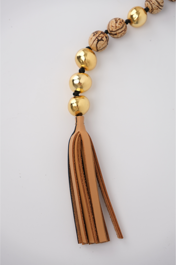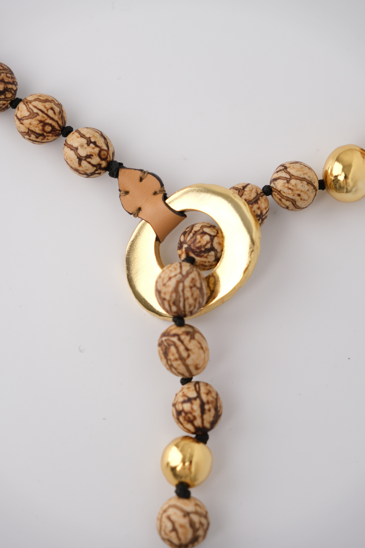 Ahora para la colección Alhaja, la clásica tagua de Ballen se transforma, con un baño de oro que eleva su origen natural con un toque de luz y sofisticación. Nuestro BOMBONA BELT celebra la versatilidad y el detalle artesanal. Puede usarse como cinturón o collar, adaptándose con naturalidad a distintos momentos y estilos.