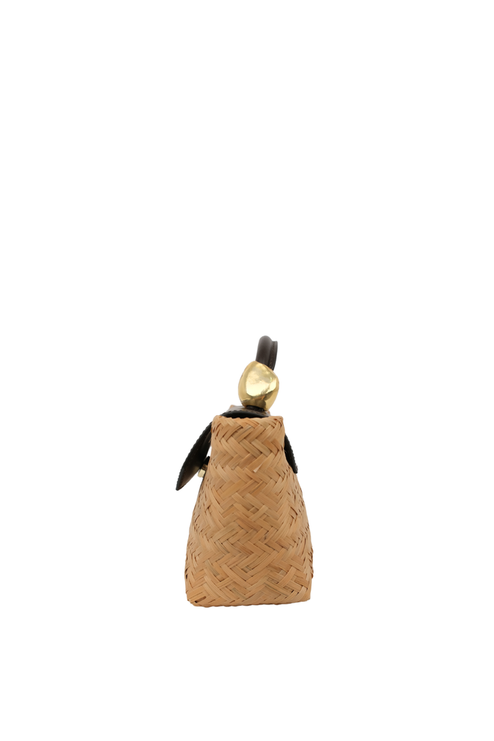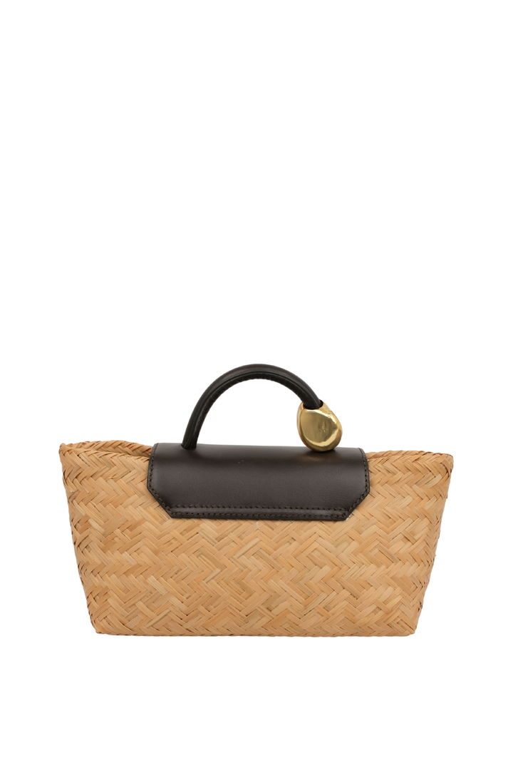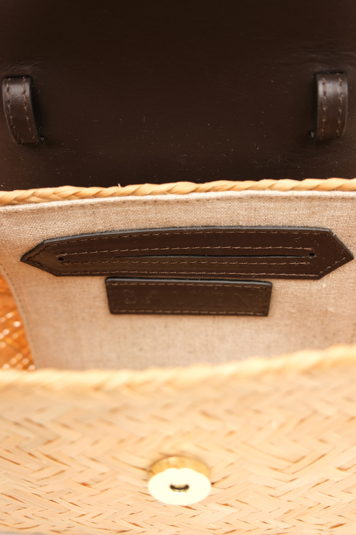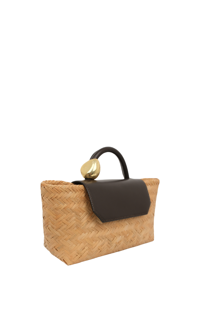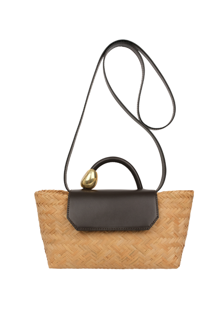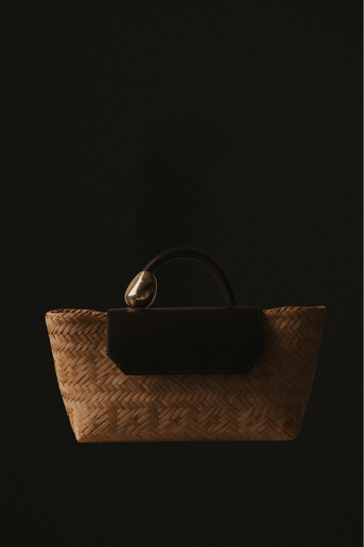 Ahora para la colección Alhaja, la clásica tagua de Ballen se transforma, con un baño de oro que eleva su origen natural con un toque de luz y sofisticación. Este canasto tejido a mano en fibra de chocolatillo tiene tapa de cierre magnético, bolsillo interno y correa removible.