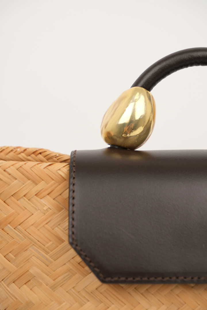 100% Fibra de Chocolatillo / 100% Cuero de Vaca / Semilla dorada / 2% Lino 15% Poliester Reciclado 83% Yute / LINING: 55% Lino 45% Rayon