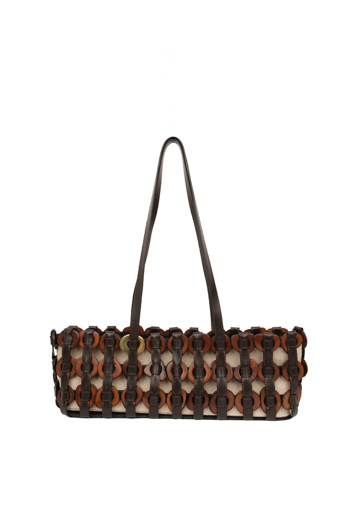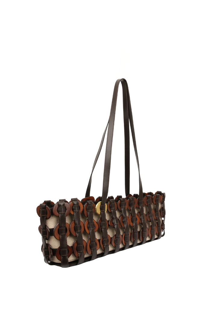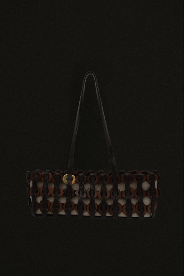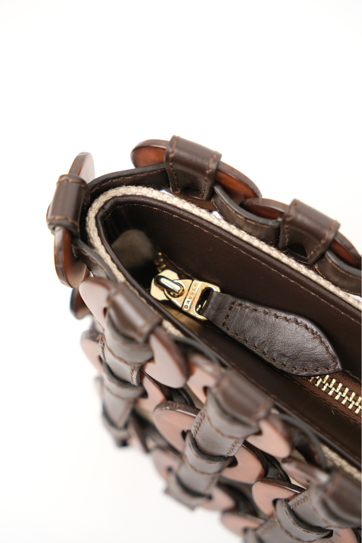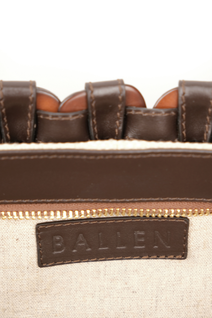 Ahora para la colección Alhaja, la clásica tagua de Ballen se transforma, con un baño de oro que eleva su origen natural con un toque de luz y sofisticación. Nuestra DEMI presenta una silueta innovadora tipo baguette, una evolución de nuestra familia de Tagua Weaving, elaborado con cuero italiano y semillas de tagua entrelazadas.