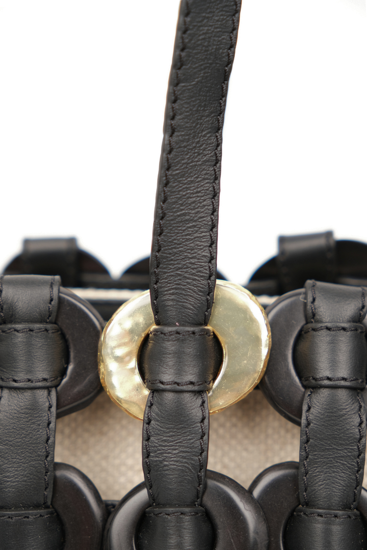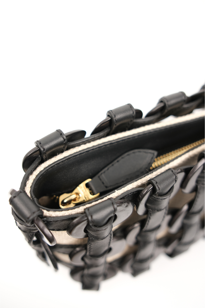 Ahora para la colección Alhaja, la clásica tagua de Ballen se transforma, con un baño de oro que eleva su origen natural con un toque de luz y sofisticación. Nuestra DEMI presenta una silueta innovadora tipo baguette, una evolución de nuestra familia de Tagua Weaving, elaborado con cuero italiano y semillas de tagua entrelazadas.