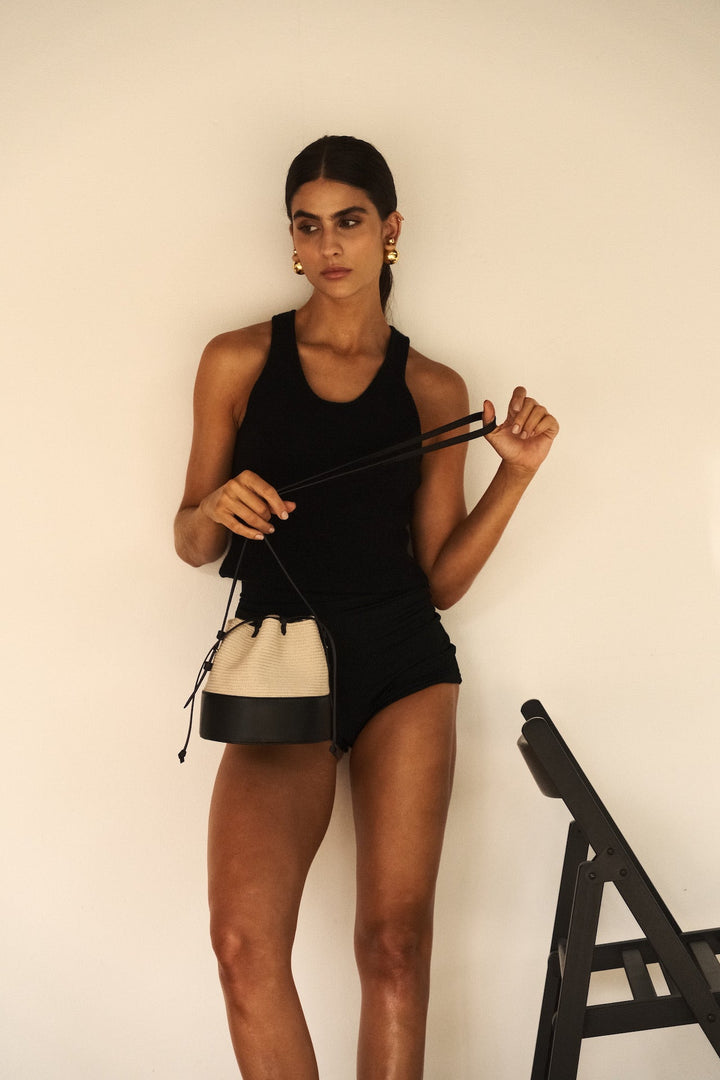 Un tesoro tejido a mano por la comunidad indígena Wayuu con intervenciones en cuero napa, esta vez en un tamaño más grande para que tengas más espacio para tus esenciales.