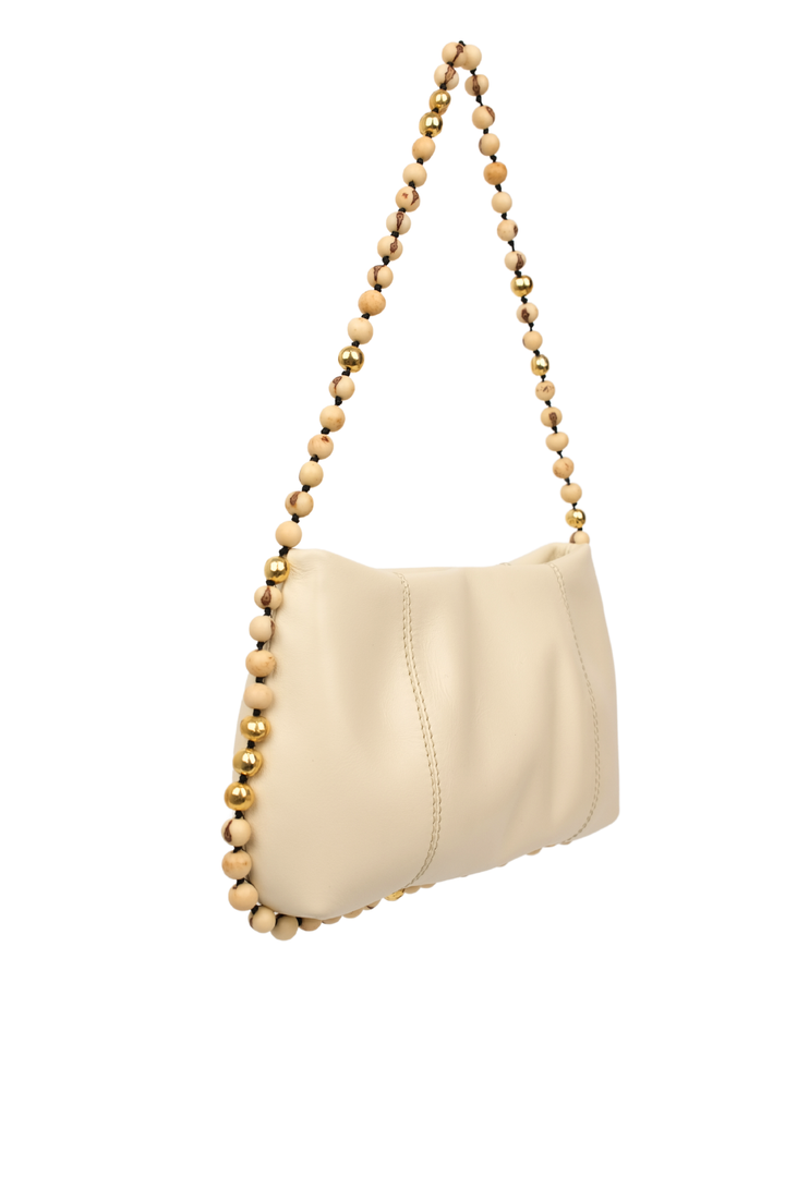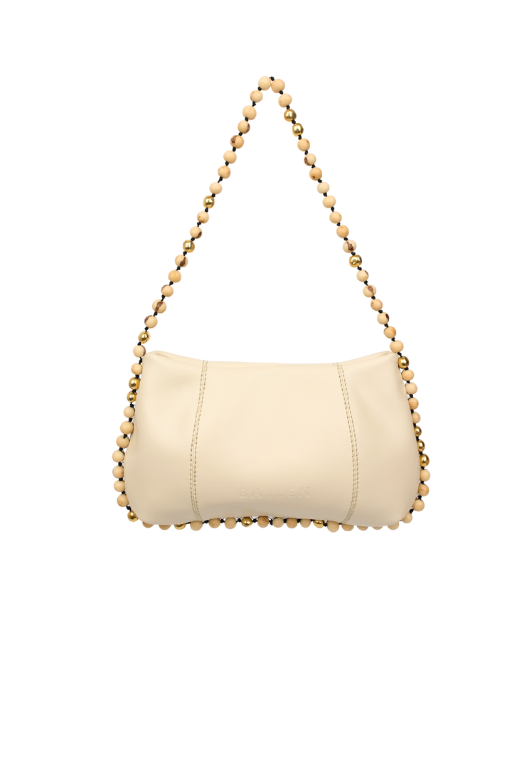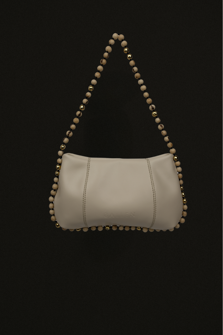 Un bolso desestructurado para el día y/o la noche con cierre superior magnético y correa de semillas de ACAI reutilizadas, que ahora para la colección Alhaja se transforman con un baño de oro que eleva su origen natural con un toque de luz y sofisticación.