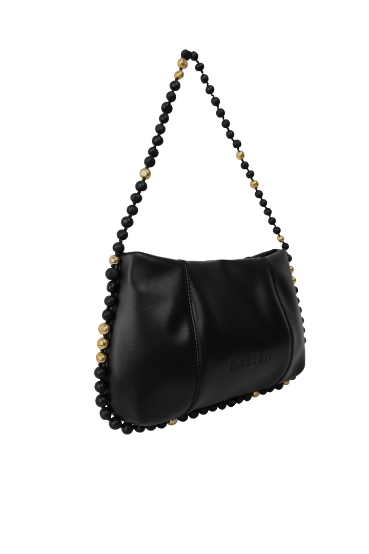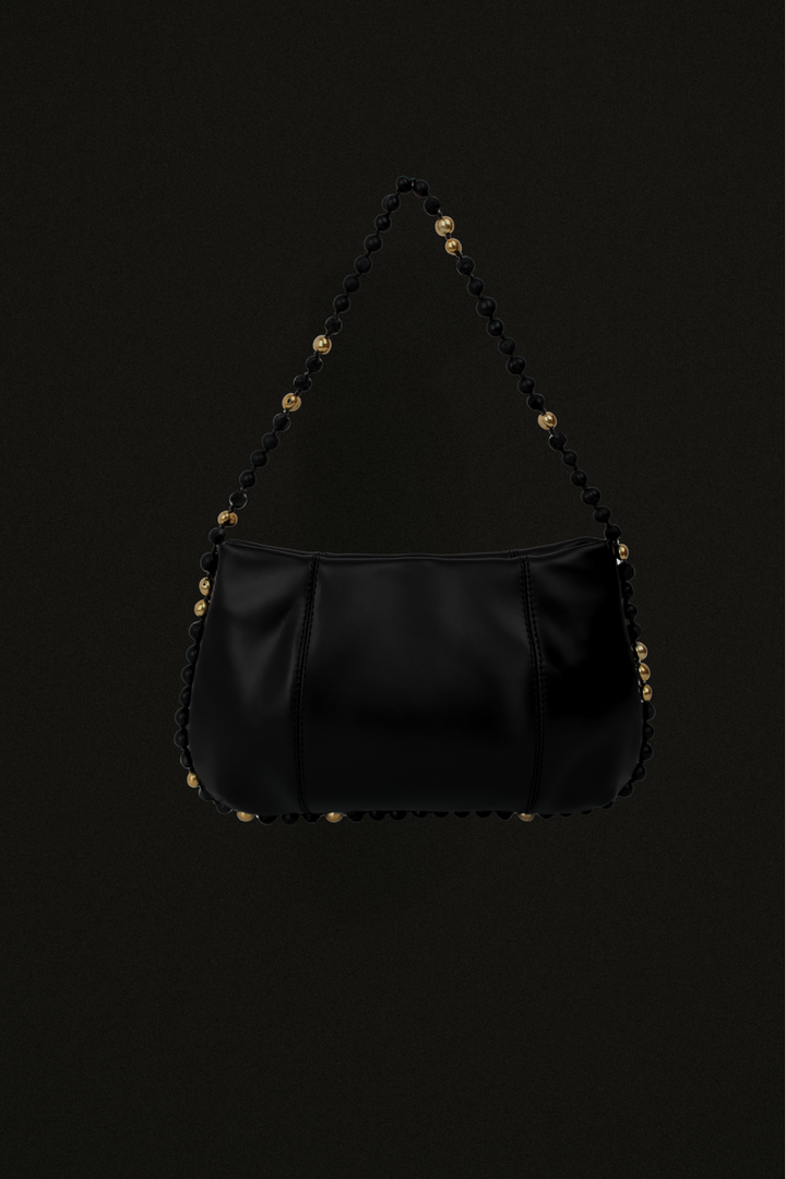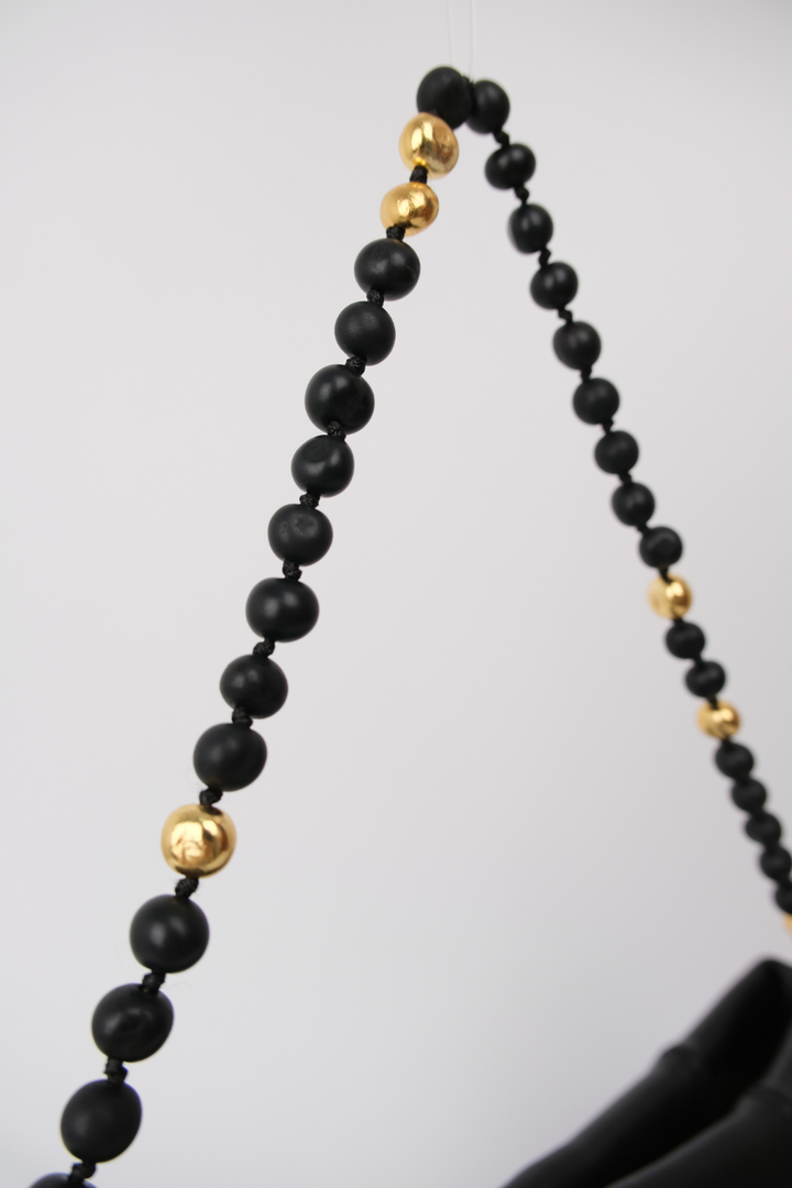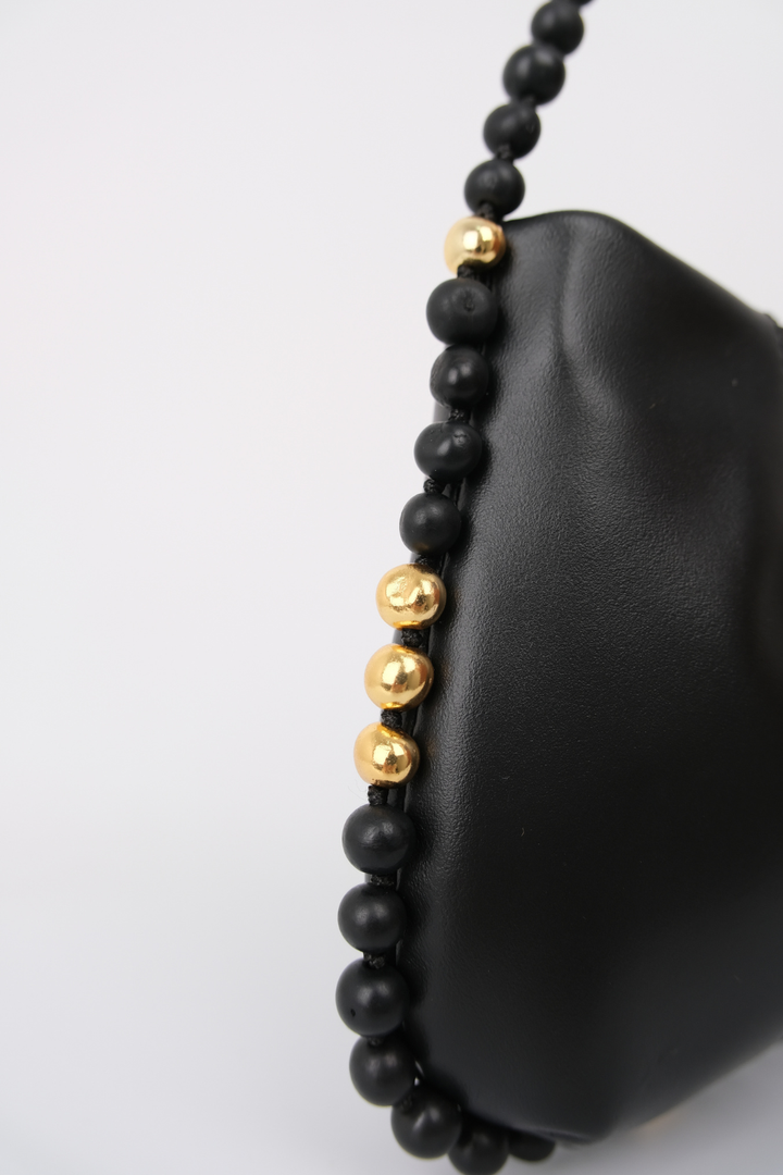 Un bolso desestructurado para el día y/o la noche con cierre superior magnético y correa de semillas de ACAI reutilizadas, que ahora para la colección Alhaja se transforman con un baño de oro que eleva su origen natural con un toque de luz y sofisticación.