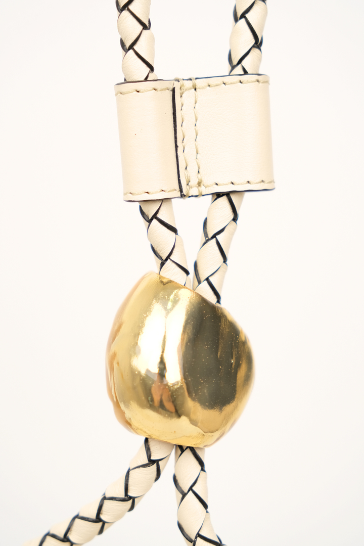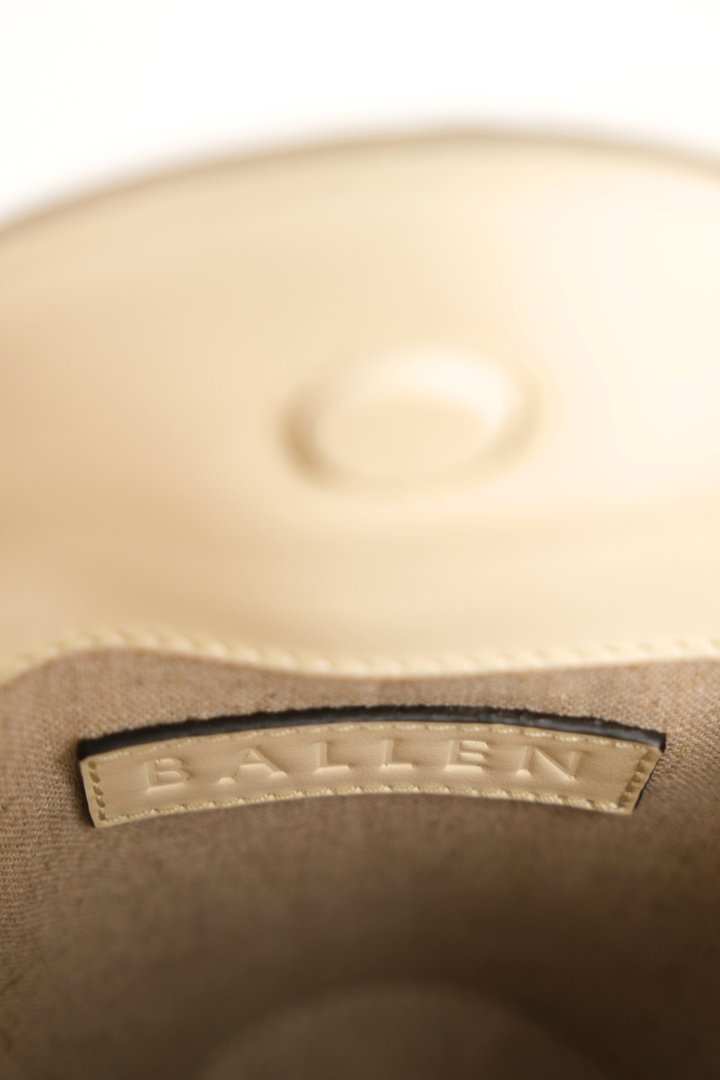 Ahora para la colección Alhaja, la clásica tagua de Ballen se transforma, con un baño de oro que eleva su origen natural con un toque de luz y sofisticación. Un bolso con la icónica correa de hombro trenzada con proporciones elegantes y un cierre superior plegado magnético. Se caracteriza por su versatilidad en su asa corta o larga para llevar en el hombro o en la muñeca.